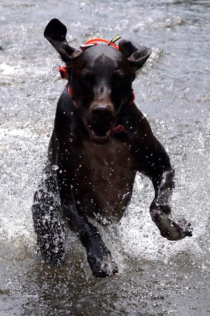 Brian and I had been talking about getting a third dog for quite some time, but found ourselves getting cold feet in the process. We had inquired about a couple of dogs, waiting for “that feeling” to emerge to indicate that we found just the right fur-child to add to our family. Brian and I had been talking about this one particular mixed-breed we both saw online in a rescue, but kept having mixed emotions, so we held off on advancing any further. On Friday August 21, 2015, as I sat on our porch waiting for Brian to get home from work, I thought I would tell him to go ahead and call about the dog we had been talking about so much to find out more information that may help us make a definite decision one way or another. Not even 30 minutes after that thought, I received a phone call from our friend, Gwen, the President of Tidewater DockDogs, one of the affiliated clubs of the DockDogs organization that we belong to, explaining that SOC had a 3 year old male GSP, who is a retired Explosives Detection Canine, in need of a home. With the dog’s best interest and love of water in mind, John, the man in charge of the dog, contacted Gwen of Tidewater DockDogs to inquire if she knew of anyone involved in the sport that is familiar with the breed, would have access to water at home, and would get the dog involved in dock diving. (There are other affiliated clubs closer to John’s location – However, Gwen was the only person listed with a phone number in reasonable proximity!!) Gwen called me immediately. During this conversation with Gwen – without even having seen a picture of the dog – there it was – – “that feeling” kicked in.
